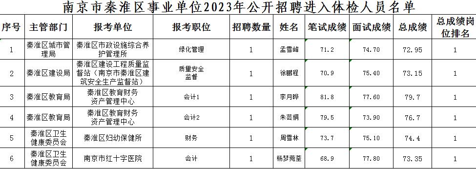 2023年江蘇南京市秦淮區(qū)事業(yè)單位招聘進(jìn)入體檢人員名單