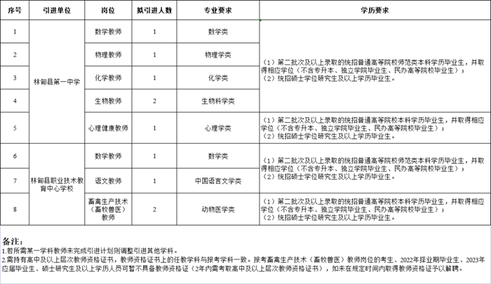 3.考生需持有高中及以上層次教師資格證書,教師資格證書上的任教學(xué)科與報(bào)考學(xué)科一致。報(bào)考畜禽生產(chǎn)技術(shù)(畜牧獸醫(yī))教師崗位的考生、2022年擇業(yè)期畢業(yè)生、2023年應(yīng)屆畢業(yè)生、碩士研究生及以上學(xué)歷人員可暫不具備教師資格證(2年內(nèi)需考取高中及以上層次教師資格證書),如未在規(guī)定時(shí)間內(nèi)取得教師資格證予以解聘。