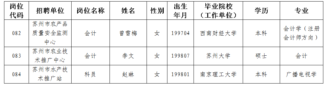 江蘇蘇州市農(nóng)業(yè)農(nóng)村局事業(yè)單位招聘工作人員錄用公示