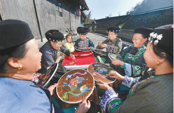 湖南省花垣縣十八洞村因地制宜發(fā)展種植、苗繡、鄉(xiāng)村旅游等特色產(chǎn)業(yè),實(shí)現(xiàn)從“輸血”到“造血”的根本轉(zhuǎn)變,走出了一條產(chǎn)業(yè)興、設(shè)施優(yōu)、品位高、保障好、生活美的脫貧致富之路。圖為十八洞村苗繡特產(chǎn)農(nóng)民專(zhuān)業(yè)合作社的繡娘在生產(chǎn)苗繡產(chǎn)品?!皧^進(jìn)新時(shí)代”主題成就展圖片