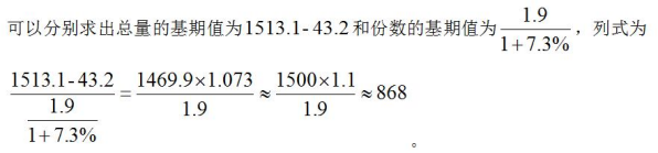 根據材料中給出的數據,當已知兩個統(tǒng)計指標總量和份數的現(xiàn)期值以及對應的增長量的時候,所求為: