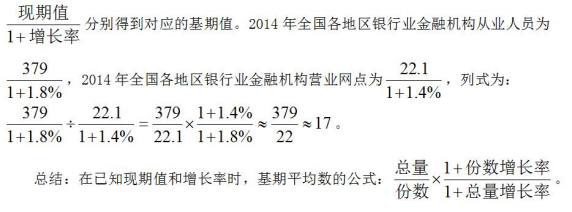 【解析】題目數據是2015年,問題問的是2014年的平均數,也就是求基期平均數,但是已知條件中給出的是現(xiàn)期的總量、份數以及對應的增長率,可以通過