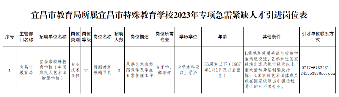 宜昌市教育局所屬宜昌市特殊教育學校2023年專項急需緊缺人才引進公告
