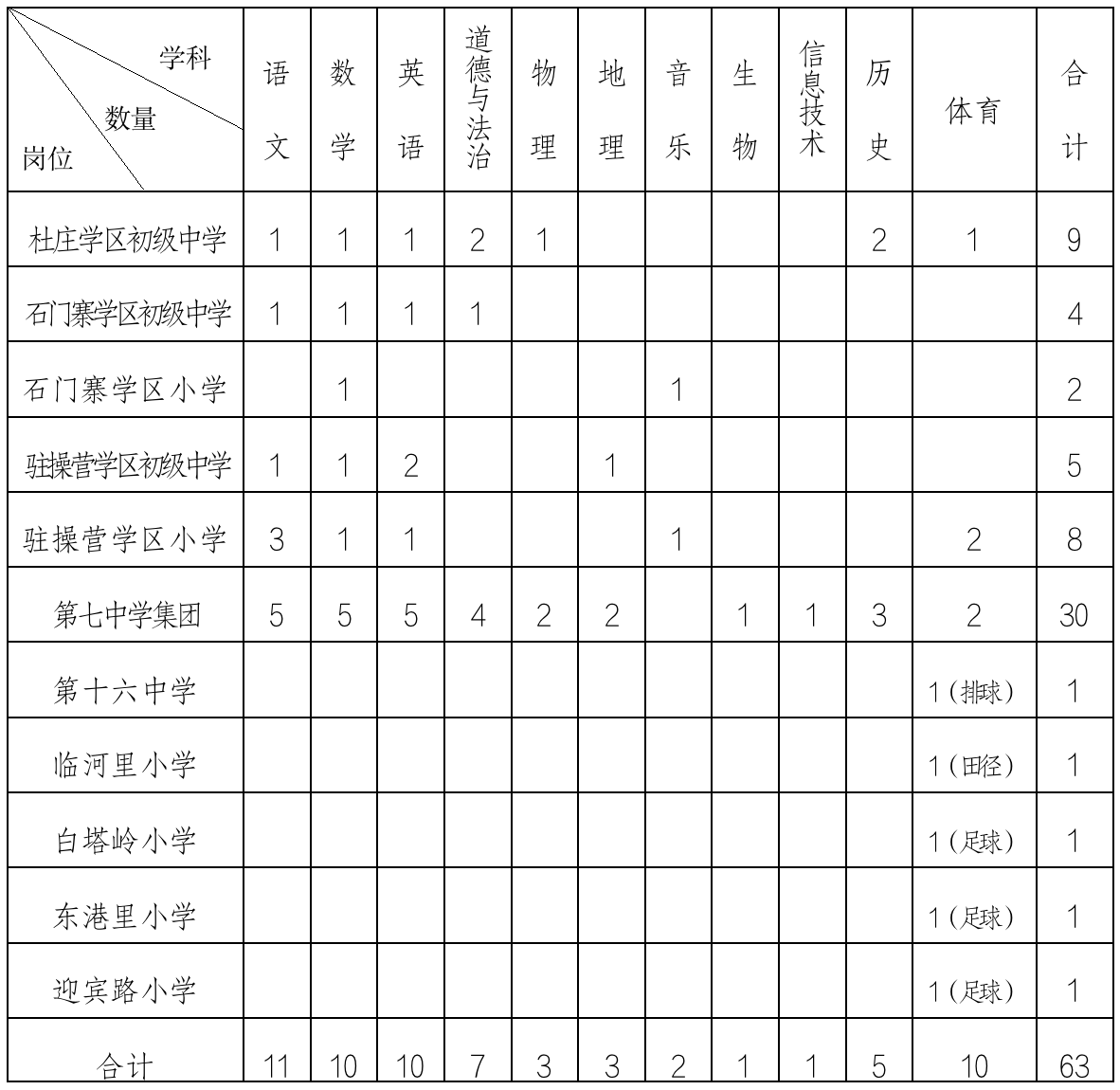 報名人數(shù)和招聘指標之比原則上不低于3:1,低于3:1的,由公開招聘工作領導小組進行指標核減。定向招聘中的專項體育(指排球、足球、田徑)報名人數(shù)如果低于3:1,指標轉到非定向體育崗位。杜莊學區(qū)、石門寨學區(qū)和駐操營學區(qū)定向招聘的報名人數(shù)和招聘指標不受3:1比例限制。