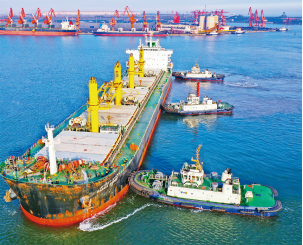 河北省交通優(yōu)勢便利,已經(jīng)形成陸??站C合交通運輸網(wǎng)絡(luò),2022年唐山港貨物吞吐量達到7.69億噸,躍居世界第二位。圖為一艘輪船在拖輪協(xié)助下向河北港口集團唐山港曹妃甸港區(qū)礦石碼頭靠泊。河北省委宣傳部供圖史晟全/攝