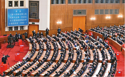 2023年3月10日,十四屆全國(guó)人大一次會(huì)議在北京人民大會(huì)堂舉行第三次全體會(huì)議,表決通過了關(guān)于國(guó)務(wù)院機(jī)構(gòu)改革方案的決定。圖為會(huì)議現(xiàn)場(chǎng)。新華社記者 岳月偉/攝