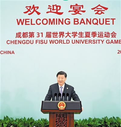 習(xí)近平發(fā)表致辭,代表中國(guó)政府和中國(guó)人民對(duì)來(lái)華出席成都第31屆世界大學(xué)生夏季運(yùn)動(dòng)會(huì)開(kāi)幕式的國(guó)際貴賓表示熱烈歡迎。(致辭全文見(jiàn)第三版)