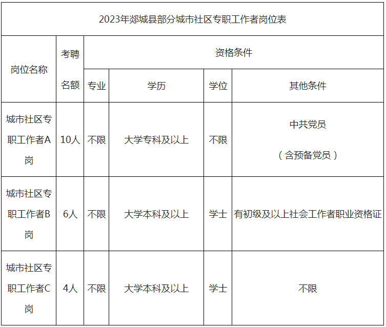 全縣計劃考聘20人,工作地點為郯城街道各城市社區(qū)。招考崗位共設(shè)A、B、C三類崗位。
