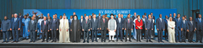 會議由南非總統(tǒng)拉馬福薩主持,巴西總統(tǒng)盧拉、印度總理莫迪、俄羅斯總統(tǒng)普京(線上)和60多位非洲國家及其他新興市場和發(fā)展中國家領導人或代表,以及聯(lián)合國秘書長古特雷斯、新開發(fā)銀行行長羅塞夫等國際和地區(qū)組織負責人出席。這是與會領導人集體合影。新華社記者李學仁攝