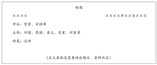 一般情況下,提綱本身不作為獨(dú)立文種考查,當(dāng)題目要求我們寫(xiě)“××提綱”時(shí),如:宣傳提綱、講話提綱、發(fā)言提綱、建議提綱、匯報(bào)提綱等,意味著我們不需要考慮格式,只需要寫(xiě)正文即可,但為了保險(xiǎn)起見(jiàn),會(huì)加上標(biāo)題,標(biāo)題一般位于第一行居中書(shū)寫(xiě)。正文內(nèi)容的書(shū)寫(xiě)格式與一般公文類似,但建議在書(shū)寫(xiě)時(shí)可在前面加上題簽或小標(biāo)簽,如調(diào)查背景、調(diào)查方法等。