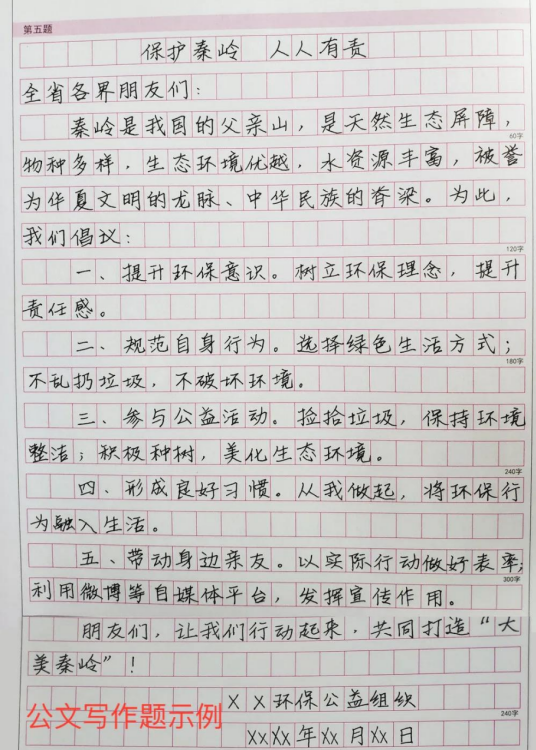 (一)標(biāo)題:首行居中。注意:標(biāo)題不需要添加“《》”。一般情況下,公文題標(biāo)題有兩種寫(xiě)法:①常規(guī)型。寫(xiě)為“關(guān)于+主題詞+的+文種”的形式。例如,關(guān)于學(xué)生減負(fù)的倡議書(shū)。②靈活型。根據(jù)題目主題自擬標(biāo)題,但標(biāo)題中需明確體現(xiàn)主題。例如,愛(ài)護(hù)環(huán)境,從你我做起。要注意:宣傳類公文往往可兩種標(biāo)題任意選取,考生可根據(jù)題目要求和自身能力決定是否寫(xiě)為靈活型標(biāo)題。