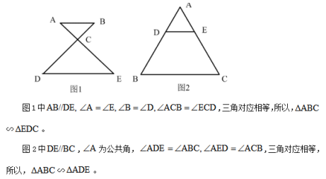 相似三角形:當(dāng)兩個(gè)三角形三角對(duì)應(yīng)相等或三邊對(duì)應(yīng)成比例,則稱這兩個(gè)三角形為相似三角形。而在我們常見(jiàn)的題目中,相似三角形往往是伴隨著平行出現(xiàn)的,比如最常見(jiàn)的兩種相似三角形如下圖所示:
