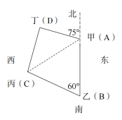 例1:甲、乙、丙、丁四人通過(guò)手機(jī)的位置共享,發(fā)現(xiàn)乙在甲正南方向2千米處,丙在乙北偏西60°方向2千米處,丁在甲北偏西75°方向。若丁與甲、丙的距離相等,則該距離為:( )