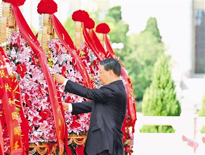 9月30日上午,黨和國家領(lǐng)導(dǎo)人習(xí)近平、李強、趙樂際、王滬寧、蔡奇、丁薛祥、李希、韓正等來到北京天安門廣場,出席烈士紀念日向人民英雄敬獻花籃儀式。這是習(xí)近平整理花籃上的緞帶。新華社記者 殷博古攝