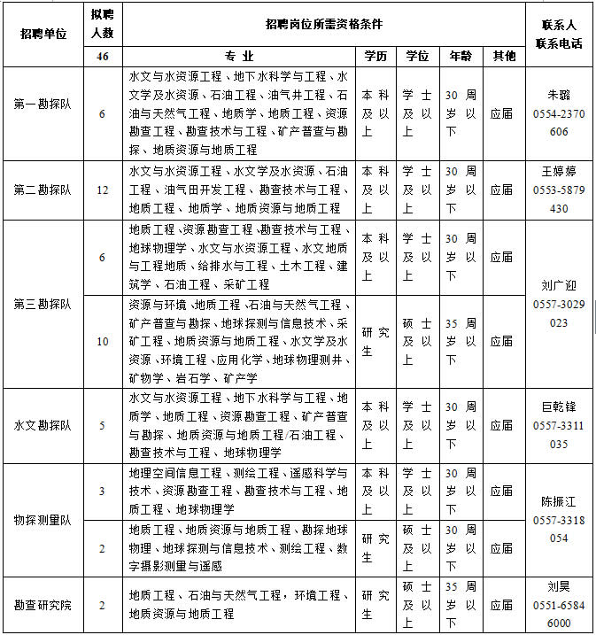 安徽省煤田地質(zhì)局歡迎莘莘學子咨詢報名,簡歷請投至專用郵箱ahsmtdzjxyzp@163.com。郵箱所收簡歷,由局勞資教育處專人負責收集整理并分發(fā)各招聘單位。各招聘單位定期邀請有意向的學生到單位參觀交流(單位統(tǒng)一安排食宿),雙方協(xié)商一致后面試、簽約。各單位招聘專員聯(lián)系方式如下: