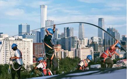 圖為2022年7月18日,在北京工人體育場改造復建工程的頂棚上,工人在太陽的余暉下作業(yè)。 工人日報記者 吳凡/攝
