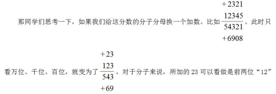 的兩倍減去第一位“1”的一倍,即可以理解為擴(kuò)大了(2×10%-1%=)19%。而對于分母來說,所加的69可以看做是前兩位“54”的一倍加上第一位“5”的三倍,即可以理解為擴(kuò)大了(10%+3×1%=)13%。那么在這個過程中,顯然分子的增長率(19%)大于分母的增長率(13%),那么這個分?jǐn)?shù)的分?jǐn)?shù)值就會變大。這種方法就是今天我們想要教給大家的快速去判斷分子、分母變化“增長率”的基本原理。