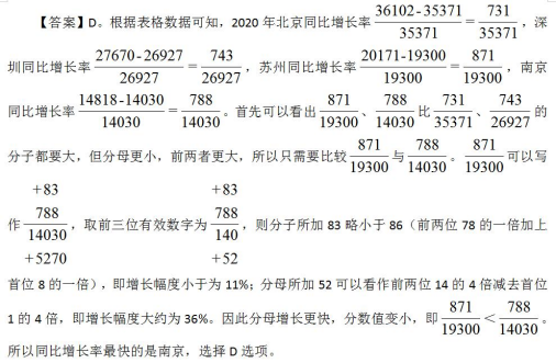 那么到這里我們就會發(fā)現(xiàn),資料分析中的比較題基本可以使用這三種方式來進(jìn)行求解。對于不同的情況,根據(jù)分?jǐn)?shù)的性質(zhì)、分子分母倍數(shù)關(guān)系以及增長率關(guān)系,就可以輕松比較。希望大家可以多多練習(xí),早日掌握,讓比較不再成為做題的短板。