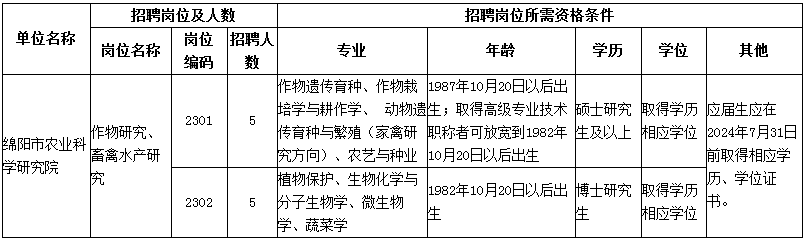 附件1、綿陽市農(nóng)業(yè)科學研究院2023年下半年公開考核招聘高層次人才崗位和條件要求一覽表