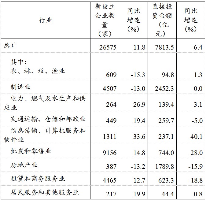 ?、诒碇杏袔讉€(gè)行業(yè)在新設(shè)立企業(yè)數(shù)和直接投資金額同比增速上均快于全國(guó)總體水平?