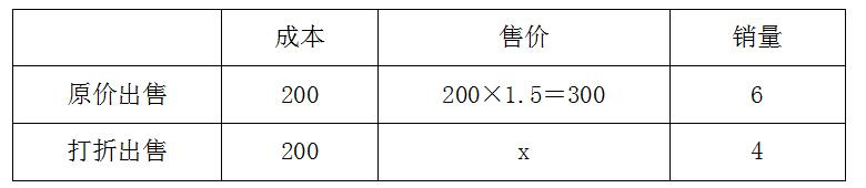 【例1】某家具店購進(jìn)一批桌椅,每套進(jìn)價(jià)200元,按期望獲利50%定價(jià)出售。賣掉這批桌椅的60%以后,店主為提前收回資金,打折出售余下的桌椅。售完全部桌椅后,實(shí)際利潤比期望利潤低了18%。問余下的桌椅是打幾折出售的?( )