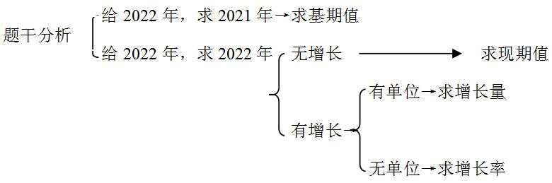 【政華點(diǎn)撥】題干分析,從左往右,先看時(shí)間,確定基期或現(xiàn)期;如果是現(xiàn)期,再看有無(wú)增長(zhǎng),若無(wú),說(shuō)明考現(xiàn)期值;若有,說(shuō)明考增長(zhǎng);最后看有無(wú)單位,有單位說(shuō)明考增長(zhǎng)量、無(wú)單位說(shuō)明考增長(zhǎng)率。