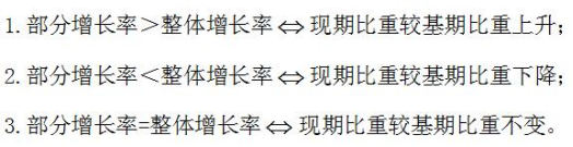 根據(jù)公式,我們可以清晰的判斷,如果部分增長率>整體增長率,則比重增長量為正,即比重上升,反之亦成立。