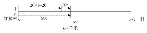 【例2】某宣講團(tuán)甲宣傳員騎摩托車從紅星村出發(fā)以20千米/時的速度去相距60千米的八一村,1小時后由于路面濕滑,速度減少一半,在甲出發(fā)1小時后,乙宣傳員以50千米/時的速度開車從紅星村出發(fā)追甲,當(dāng)乙追上甲時,他們與八一村的距離為( )