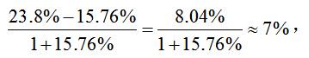 ,問題所求為現(xiàn)期平均數(shù)比上年上升/下降百分之幾,為平均數(shù)增長率考點(diǎn)。由材料可知,2014年注冊資本金額同比增長23.8%;新登記注冊外商投資企業(yè)同比約增長15.76%。則2014年,新登記注冊外商投資企業(yè)戶均注冊資本約比上年同期增長