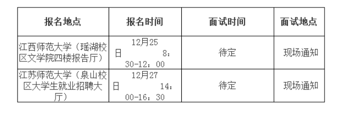 本次招聘在江西師范大學(瑤湖校區(qū))、江蘇師范大學(泉山校區(qū))等地設招聘點,采取現(xiàn)場報名的方式。