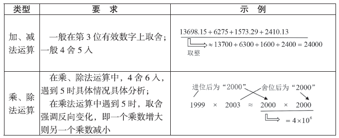 有效數(shù)字法:在計算多位有效數(shù)字的數(shù)據(jù)時,可將其個位、十位或百位等的數(shù)據(jù)根據(jù)具體情況進(jìn)行舍位,得到相對簡單的數(shù)據(jù),再進(jìn)行計算。