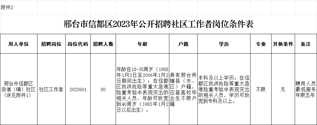 2.《邢臺市信都區(qū)2023年公開招聘社區(qū)工作者崗位條件表》