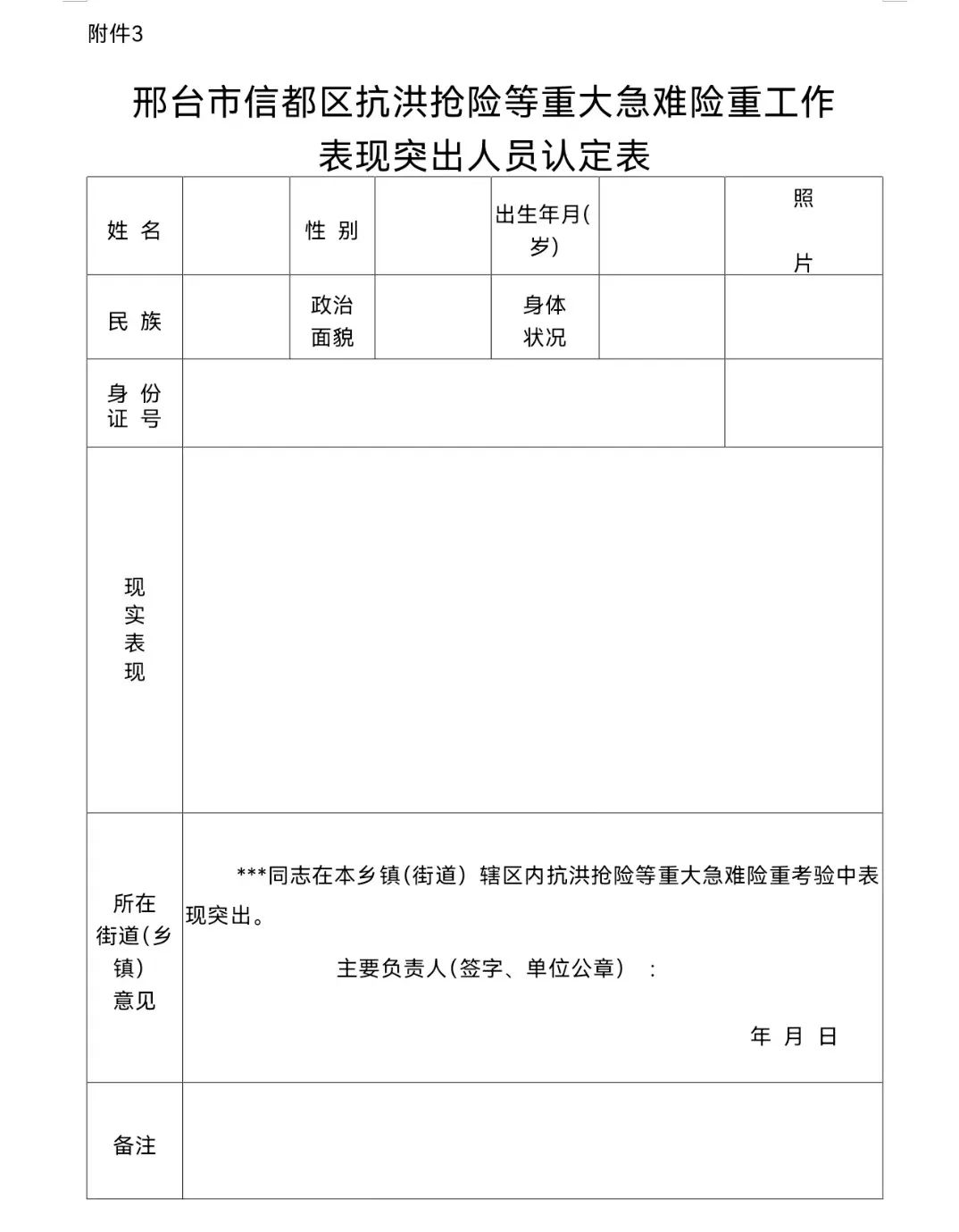3.《邢臺市信都區(qū)抗洪搶險等重大急難險重工作表現(xiàn)突出人員認(rèn)定表》