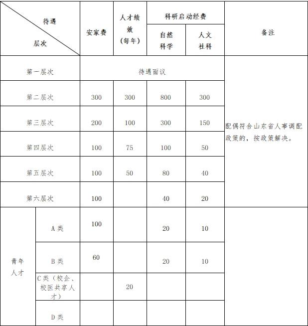 ?。ㄒ唬└黝愐M(jìn)人才除享受國(guó)家及學(xué)校規(guī)定的基本工資待遇外,學(xué)校在安家費(fèi)、科研啟動(dòng)經(jīng)費(fèi)等方面提供以下待遇。(人民幣,單位:萬(wàn)元)