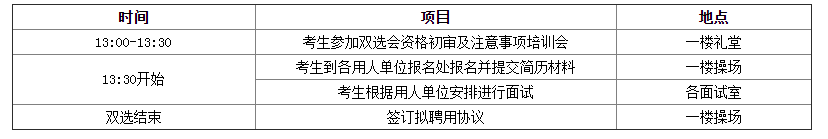 應(yīng)聘人員需在上述時(shí)間內(nèi)攜帶應(yīng)聘材料至雙選會(huì)會(huì)場(chǎng)參加公開(kāi)招聘,未到場(chǎng)者視為自動(dòng)放棄招聘資格,具體安排如下: