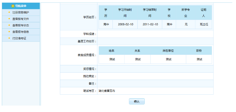 通過點(diǎn)擊“報(bào)名信息確認(rèn)”按鈕后,跳轉(zhuǎn)到報(bào)名信息確認(rèn)頁面,如下圖所示: