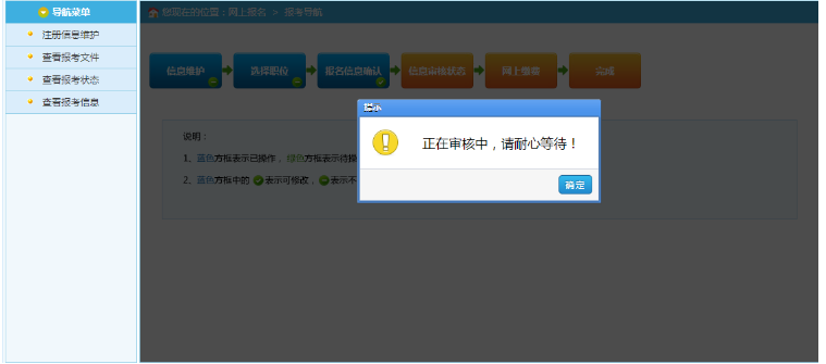 通過點(diǎn)擊“確認(rèn)”按鈕,提示確認(rèn)成功后跳轉(zhuǎn)到報(bào)考流程頁面。進(jìn)入審核狀態(tài),等待審核員進(jìn)行資格審核。