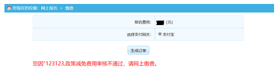 “網(wǎng)上繳費(fèi)”界面提示“您因XXXX政策減免費(fèi)用審核不通過,請網(wǎng)上繳費(fèi)”時(shí),需重新生成訂單,進(jìn)行網(wǎng)上繳費(fèi)。