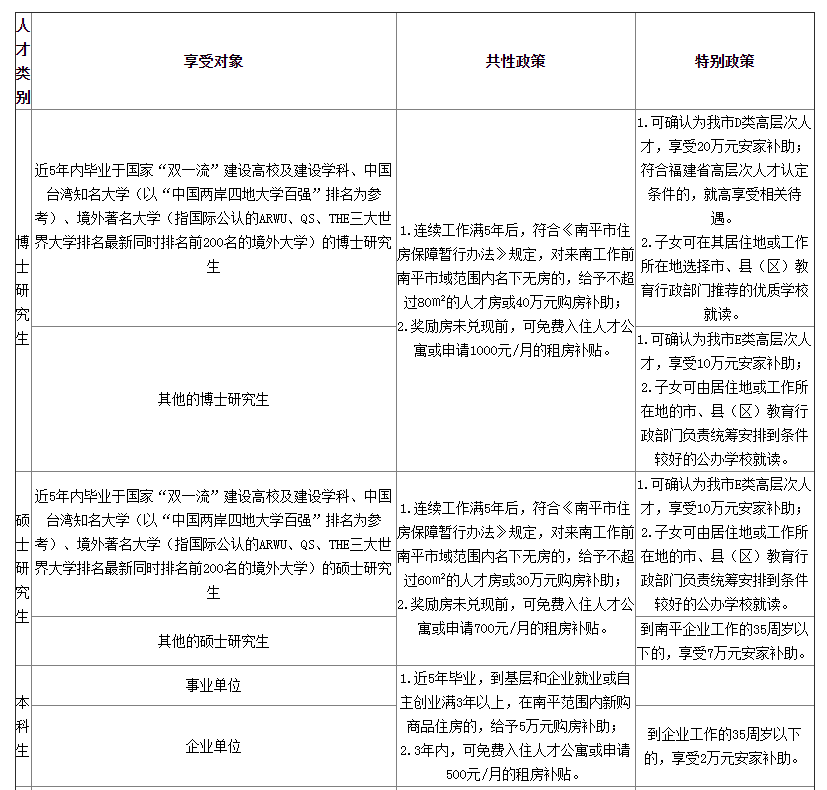 2.招引到的各類普通全日制本科及以上學(xué)歷畢業(yè)生,符合條件的可登陸“智匯武夷”線上平臺(tái)申請(qǐng)享受我市各類人才政策待遇,具體如下: