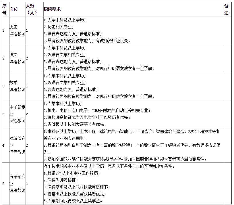 本次主要招聘涵蓋語文、歷史、數(shù)學(xué)等公共基礎(chǔ)課教學(xué)崗位4個(gè),電子、建筑、汽車等專業(yè)課教學(xué)6個(gè)。具體崗位及要求見下表。