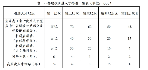 ?。ㄒ唬└鶕?jù)《蘭州工業(yè)學(xué)院高層次人才引進(jìn)與管理辦法(試行)》(蘭工院〔2022〕95號(hào)),全職引進(jìn)高層次人才分為四個(gè)層次,具體待遇見表一: