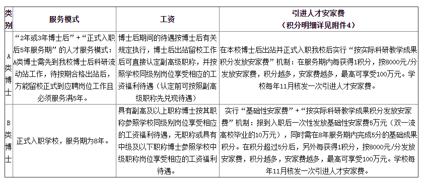不同類別博士的條件、服務(wù)模式與工資待遇不一樣,最高可以拿到100萬(wàn)元引進(jìn)人才安家費(fèi),具體如下:
