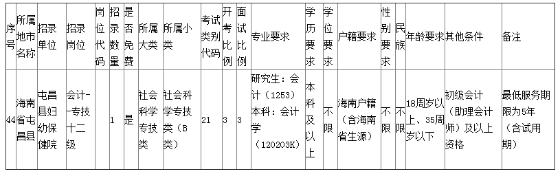 一、招聘崗位條件更正。屯昌縣婦幼保健院會(huì)計(jì)--專技十二級(jí)招聘崗位條件中的所屬大類、所屬小類和考試類別代碼分別由原來的“醫(yī)療衛(wèi)生類、醫(yī)學(xué)技術(shù)崗位(E類)、55”相應(yīng)修改為“社會(huì)科學(xué)專技類、社會(huì)科學(xué)專技類(B類)、21”;年齡要求由“18周歲以上、35周歲以下(中級(jí)放寬至40歲,高級(jí)放寬至45歲)”修改為“18周歲以上、35周歲以下”。更正后該崗位招聘條件如下: