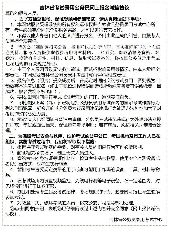 3、考生認(rèn)真閱讀‘吉林省考試錄用公務(wù)員考生誠(chéng)信須知’(如圖1-3)后,點(diǎn)擊‘同意’即可進(jìn)入登錄及注冊(cè)頁面,如果點(diǎn)擊‘不同意’則返回到圖1-1頁面。