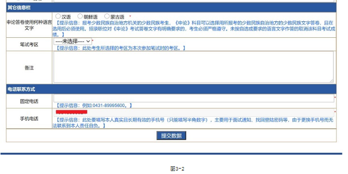 點(diǎn)擊圖3-1中‘報(bào)名資料填寫’按鈕會(huì)顯示如圖3-2頁面,考生填寫相應(yīng)的信息,帶有‘*’字樣的為必填項(xiàng),填寫完畢后點(diǎn)擊‘提交數(shù)據(jù)’即可。