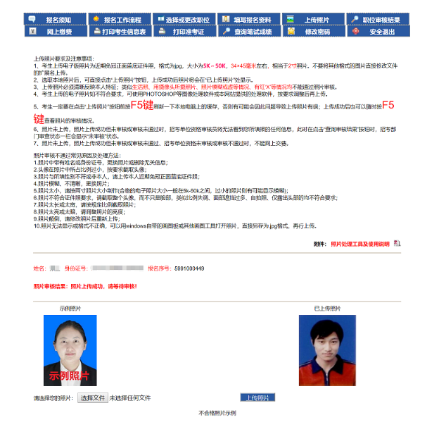 4、點(diǎn)擊‘上傳照片’按鈕,顯示‘已上傳照片,未審核,請(qǐng)等待審核!’如圖4-4,查看照片是否通過,可在圖4-4的頁面進(jìn)行查看??忌牲c(diǎn)擊“不合格照片示例”按鈕查看不符合要求的照片(僅做示例)。