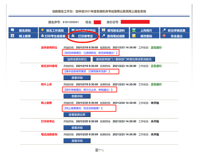 2、打印準(zhǔn)考證的時(shí)間在‘報(bào)名工作流程’下的‘打印準(zhǔn)考證’位置查看,如圖7-1