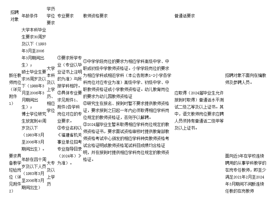 5.專(zhuān)業(yè)條件設(shè)置為“××類(lèi)”的招聘崗位,符合《福建省機(jī)關(guān)事業(yè)單位招考專(zhuān)業(yè)指導(dǎo)目錄(2024年》中“××類(lèi)”所列專(zhuān)業(yè)的報(bào)考者準(zhǔn)予報(bào)考;專(zhuān)業(yè)條件設(shè)置為具體專(zhuān)業(yè)名稱(chēng)的招聘崗位,符合所列專(zhuān)業(yè)(詳見(jiàn)本公告附表1、附表2、附表3崗位)的報(bào)考者準(zhǔn)予報(bào)考。對(duì)博士和留學(xué)人員的專(zhuān)業(yè)要求按相近原則認(rèn)定。