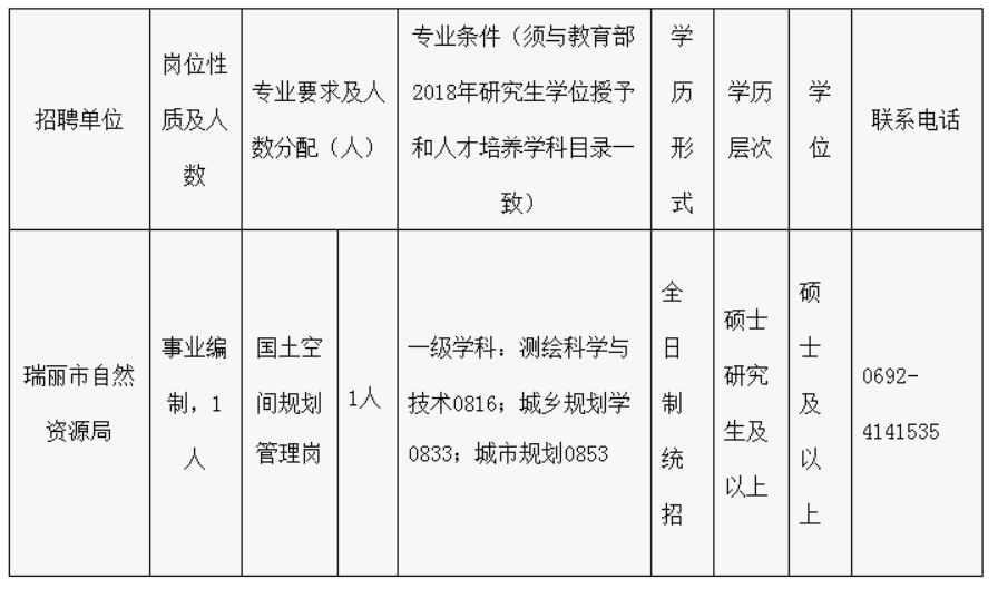 瑞麗市自然資源局城鄉(xiāng)規(guī)劃管理中心1人。具體崗位、條件要求等詳見附件1。