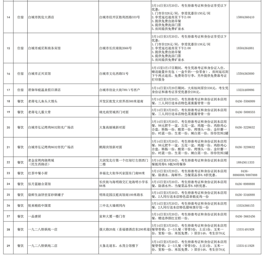 考試期間為各位考生提供優(yōu)惠服務(wù),市內(nèi)部分酒店、賓館及餐飲門店為您提供代金券優(yōu)惠和打折等服務(wù)。祝您考試順利,取得優(yōu)異的成績!